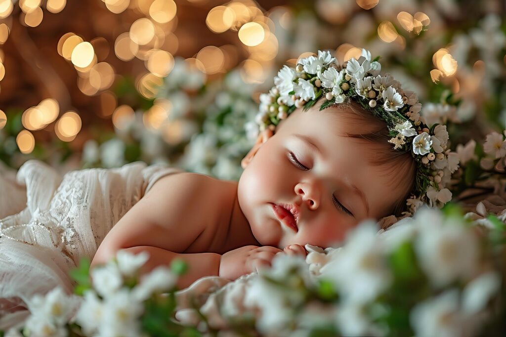 Soft, diffused lighting creates the magical glow seen in newborn photos. Natural light from a window or gentle studio lighting helps capture the baby’s purity without harsh shadows.